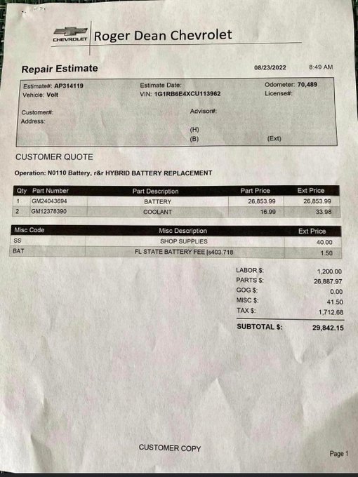 Repair costs can be shocking! For example, one Chevy Volt owner reports a bill of nearly $30,000 dollars to replace a battery after a little over 70,000 miles.